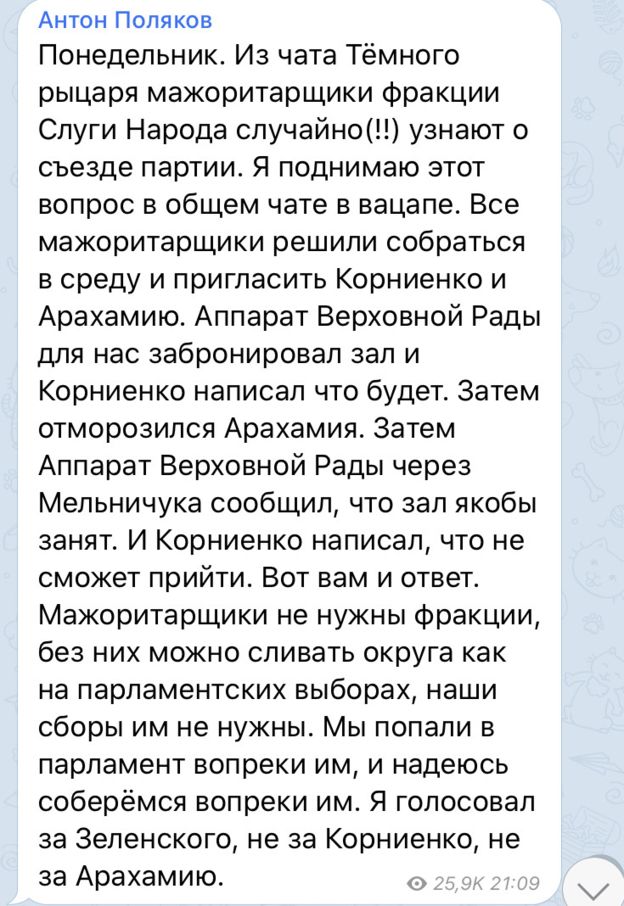Цю риторику підхопив мажоритарник з Чернігівщини Антон Поляков, який у своєму Telegram-каналі розповів, що дізнався про з’їзд саме від “Темного лицаря”, після чого ініціював зустріч всіх мажоритарників з керівниками фракції Арахамією та Корнієнком.