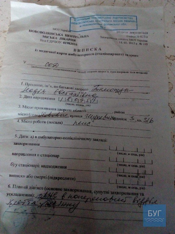 Син Надії розповів, що його мама звернулась в Нововолинську міську лікарню із болем в спині. Жінка провела близько двох тижнів лікування в неврологічному відділенні та покращання не було. Після проведення КТ та УЗД у Надії виявили метастатичне ураження поперекового відділу хребта та метастази в печінці.