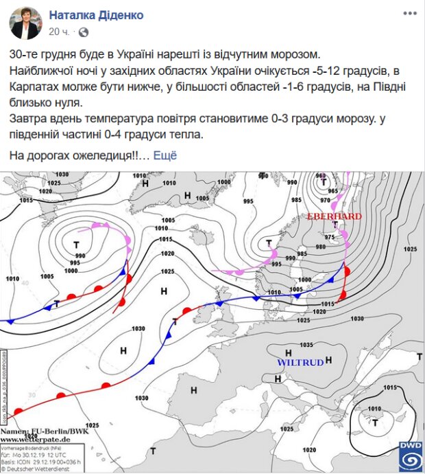 В останні два дні грудня до України нарешті прийдуть справжні новорічні морози та сніг, повідомляє синоптик Наталія Діденко на своїй сторінці у Facebook.