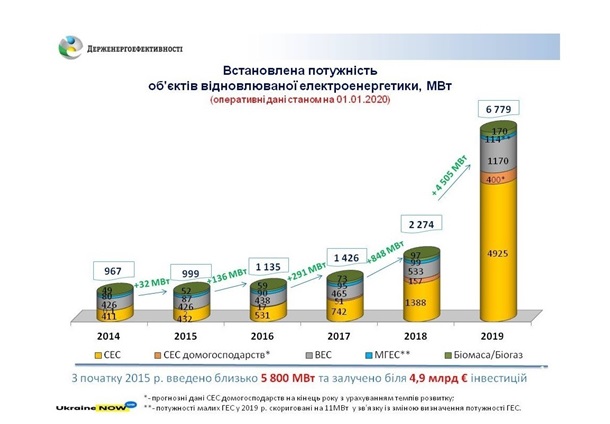 У відновлювану електроенергетику України у 2019 році інвестували близько 3,7 млрд євро, а потужності досягли рекордних 4500 МВт, повідомляє прес-служба Держагентства з енергоефективності та енергозбереження.