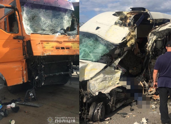 Там відбулося лобове зіткнення маршрутного мікроавтобуса Volkswagen Crafte, який рухався з Києва, з фурою «МАН».Вантажівка з причепом виїхала на зустрічну смугу руху.