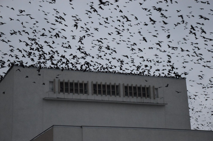 Дуже чисельну зграю ворон помітили у небі над Луцьком ввечері у вівторок, 26 січня.