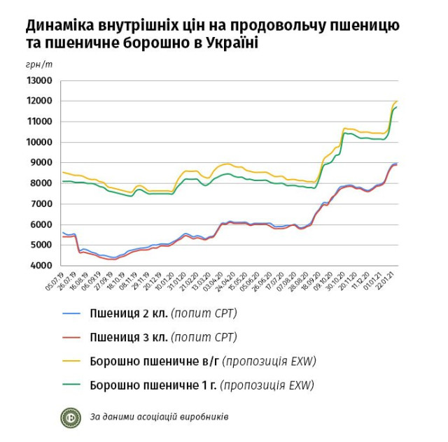 Лише за перший тиждень лютого вартість борошна стрибнула на 1000-1400 грн/т і перевищила позначку 12 тис грн/т. Інколи ціна підвищувалася двічі протягом одного дня. Аналогічна ситуація на ринку цукру.