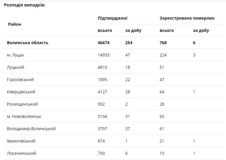 За останню добу на Волині зареєстровано 254 нових підтверджених випадки коронавірусної хвороби COVID-19 (з них дітей – 12, медпрацівників – 14). Одужало за добу – 57 осіб, летальних випадків – 6.