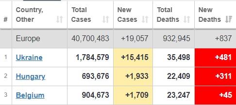 Як ми писали, за минулу добу коронавірус в Україні виявили у 15 415 осіб, зафіксовано 481 летальний випадок, 11 472 пацієнти одужали, госпіталізували 5587 людей.