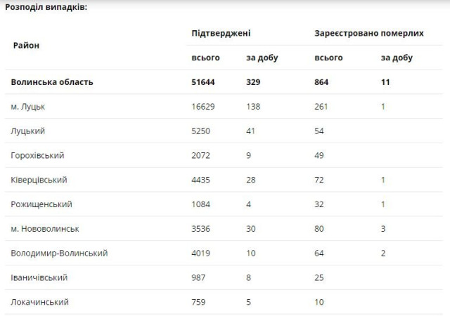 За останню добу на Волині зареєстровано 329 нових підтверджених випадків коронавірусної хвороби COVID-19 (з них дітей – 14, медпрацівників – 23). Одужало за добу – 331 особа, летальних випадків – 11.