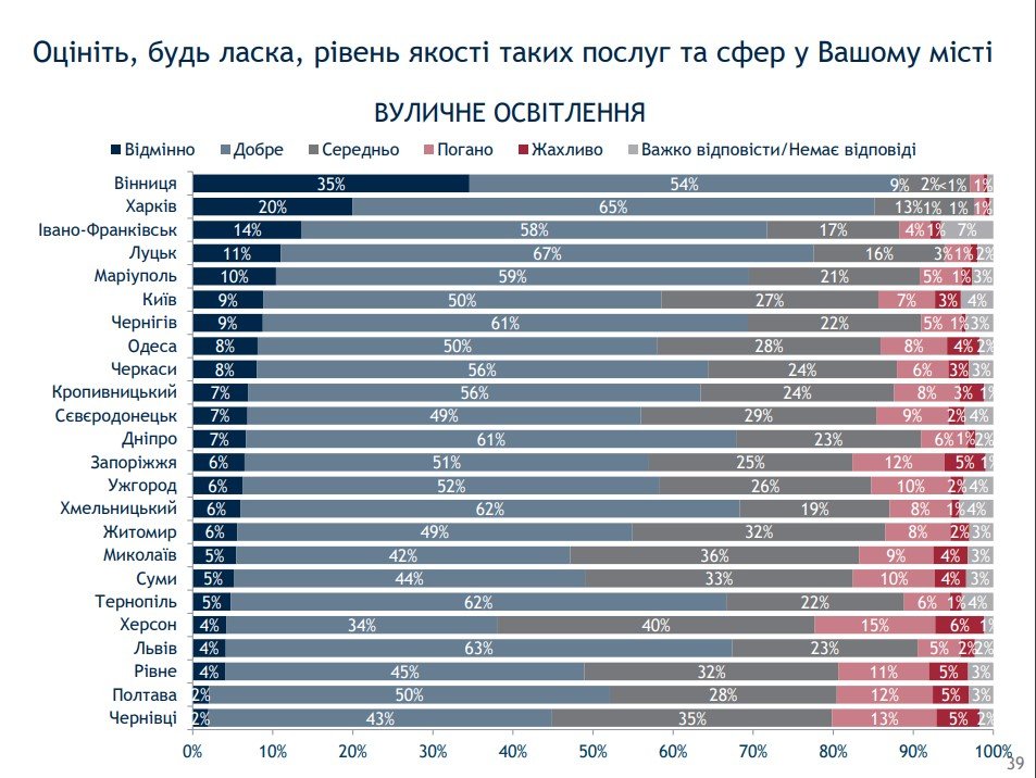 53% респондентів переконані, що медичні заклади в Луцьку працюють відмінно, добре та середньо. Практично стільки ж людей впевнені, що транспортна інфраструктура в місті розвинена відмінно та добре. Значно краще, за показниками рейтингу, в Луцьку зроблено вуличне освітлення. Це позитивно оцінили 78% громадян.