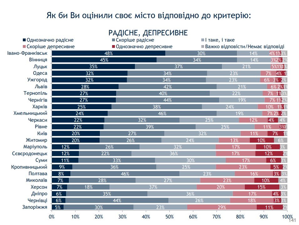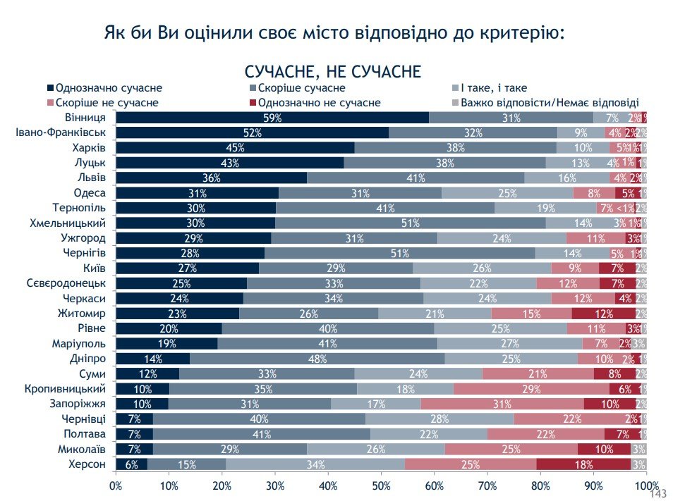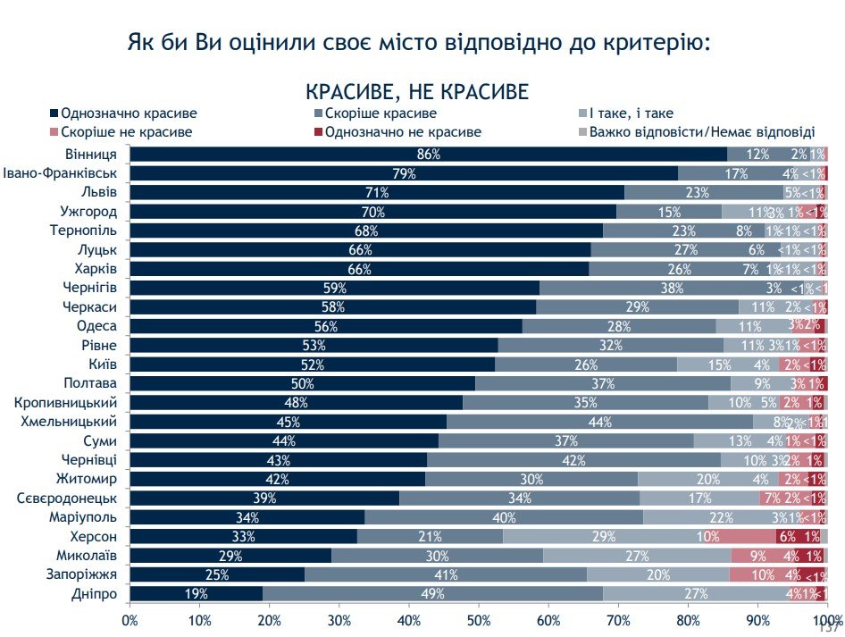 Луцьк – сприятливе місто для успішної молоді, про що зазначили 58% громадян. 93% вважають наше місто красивим, 79% – доглянутим, 72% – радісним, 81% – сучасним та 83% – розквітаючим. Безпечними в Луцьку почувають себе 71% респондентів.