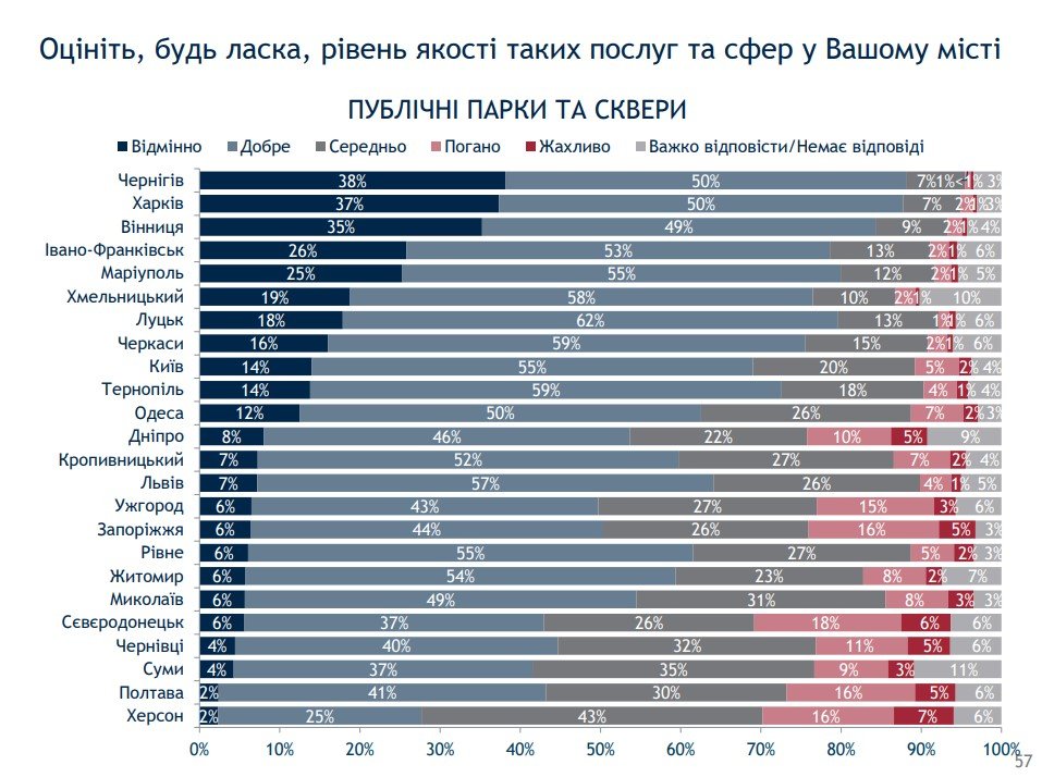 Якісно оцінили лучани й роботу міської влади щодо облаштування парків та скверів (80%), а також дворів та прибудинкових територій (83%).
