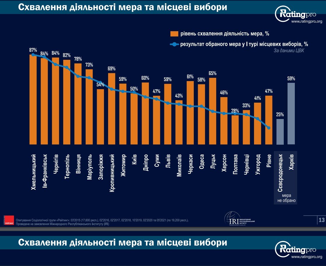 Тим часом на 33% зросла різниця між результатами першого туру виборів міського голови та рівнем схвалення його діяльності нині. Якщо тоді показник становив 32%, то зараз вже 65%. За цим показником луцький міський голова лідирує в державі.