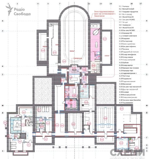 Згідно з цими документами, приміщення у маєтку відведені, зокрема, під шубосховище, сервізну, склади картин, килимів та суконь, секретну кімнату тощо. Відповідно до документів, маєток складається з чотирьох поверхів (один цокольний), має два ліфти – службовий та для мешканців, а також більше сотні приміщень різного призначення.