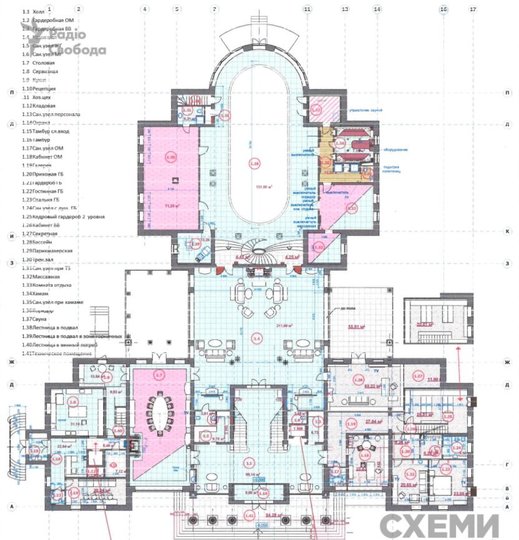 На цокольному поверсі – кімната для покоївок та чоловічий і жіночий житлові блоки. Тут же – складські приміщення: для шуб, для картин, для килимів, для валіз, для скатертин, окремий гардероб для суконь. Також є зона відпочинку: гідромасажна, масажна, сольова кімната, зона гідромасажних ванн з приміткою «узгоджується із замовником» і технічна зона. Є окрема кімната площею 28 квадратних метрів, підписана як «склад ялинкових іграшок».