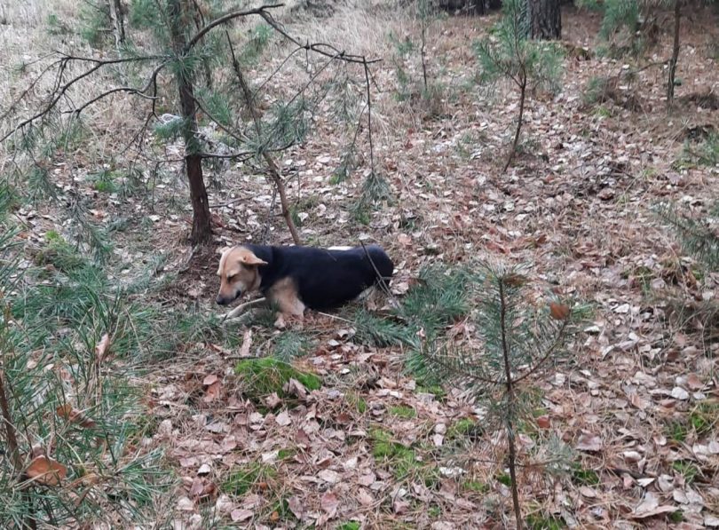 Тварину, прив’язану до дерева ланцюгом та скотчем, виявив Дмитро Кушнерук. Він і опублікував фото собаки у фейсбуці.