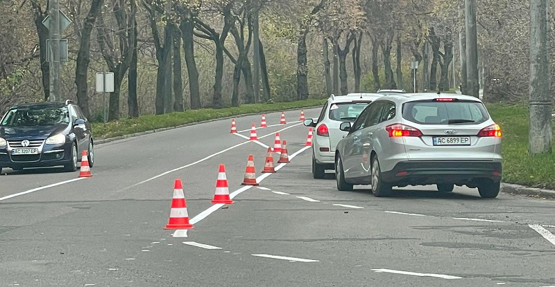 Аби автомобілі не пошкодили свіжу фарбу, розмітку прикрили конусами безпеки.