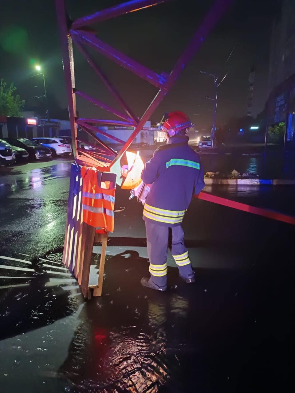 На вулиці Кравчука рятувальники демонтували пошкоджену конструкцію біля торгових контейнерів на ринку «Варшавський», що впала на стоянку.