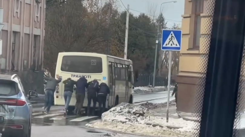 У Луцьку пасажирам маршрутки №57 довелося штовхати автобус, аби він завівся.