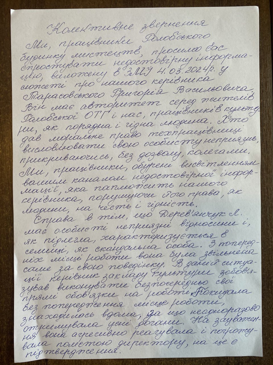 Після виходу сюжету про зниклі гроші на адресу ЗМІ з офіційної пошти Голобського будинку мистецтв надійшов лист. Його автори назвали це колективним зверненням. Під листом – вісім прізвищ.