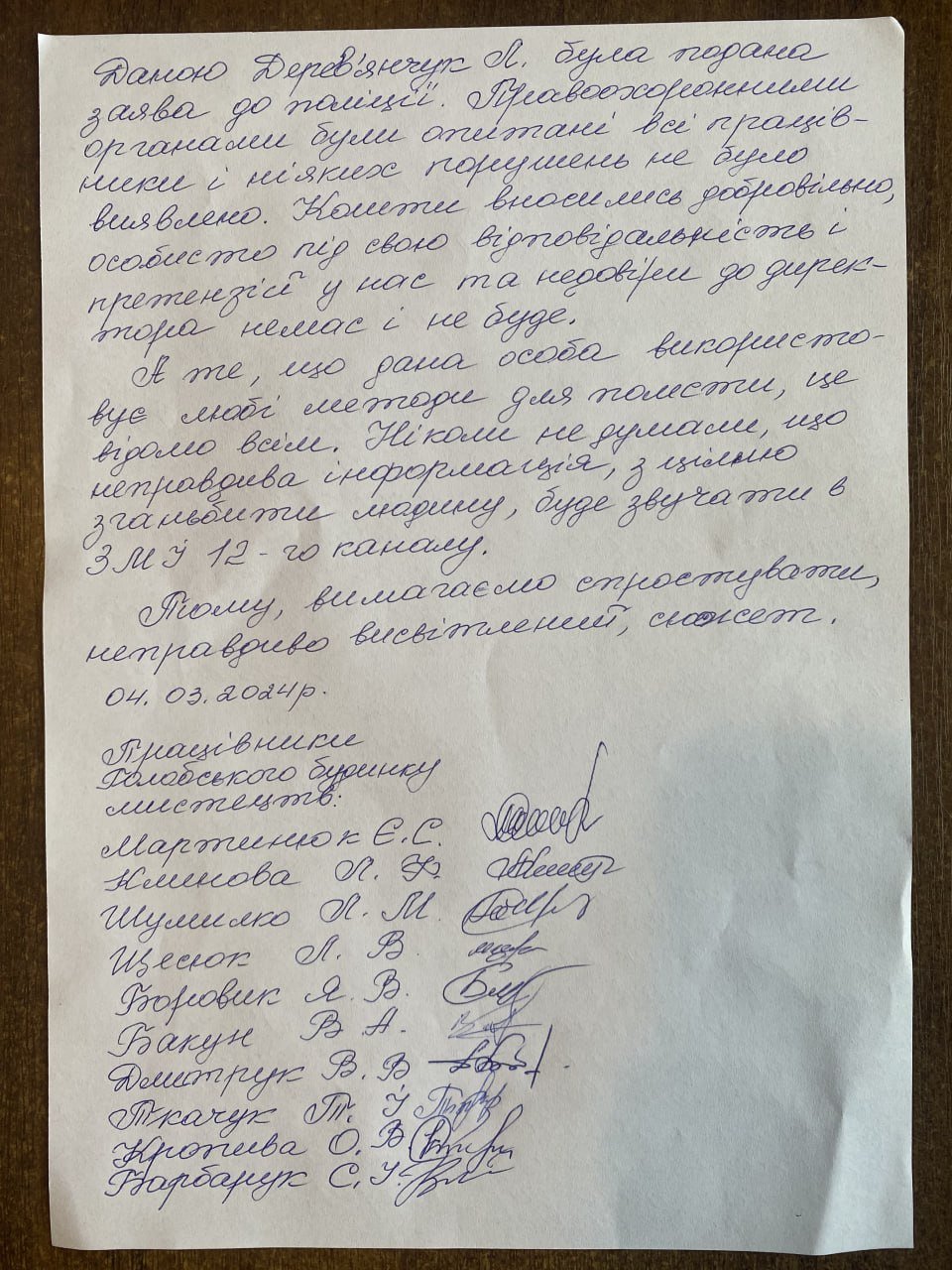 «Хто дав моральне право техпрацівниці висловлювати особисту неприязнь, прикриваючись без дозволу колегами? Ми, працівники, обурені висвітленням на вашому каналі недостовірної інформації, яка паплюжить нашого керівника, порушуючи його права як людини на честь та гідність», – вказують у листі.