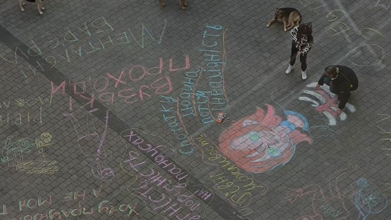 «Ми тут розмальовуємо бруківку заради підтримки людей з інвалідністю. Цими надписами ми доносимо людям про проблеми, які існують», – каже учасник акції Максим Чайковський.