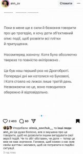 “Поки в мене ще є сили й бажання говорити про цю трагедію, я хочу дати обʼєктивний опис події, щоб розвіяти всі плітки й припущення. Насамперед зазначу: Катя була абсолютно твереза та повністю екіпірована. Це був наш перший раз на Драгобраті.Попередні дні ми каталися на Буковелі, і Катя стояла на лижах лише третій день.