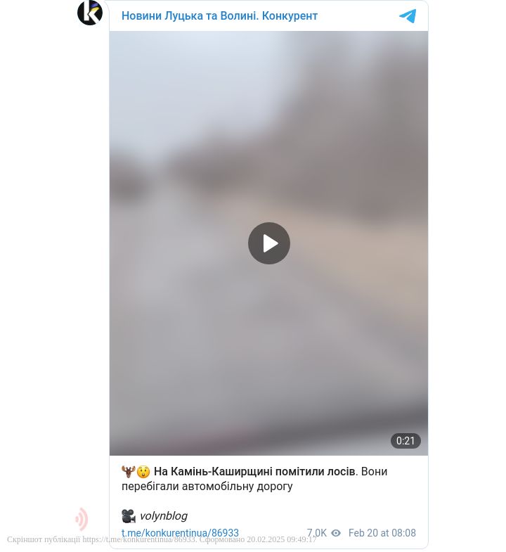 На дорозі у Камінь-Каширському районі несподівано з’явилися лосі. Декілька тварин вибігли перед автомобілями й швидко втекли у ліс.