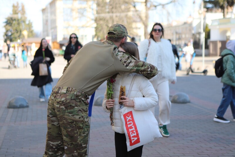 Вітання дівчат та жінок ветеранами російсько-української війни, що пережили ампутації та поранення. Хлопці дарували квіти та теплі слова перехожим жінкам та дівчатам. Цього дня «дякую» звучало з вуст ветеранів та жінок. І воно було надзвичайно щемливим, сповненим тепла, вдячності, любові та надії…