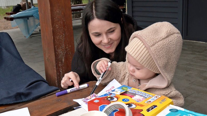 Родина Карабанів малювала картину та спілкувалася з іншими сім’ями, розповідаючи свою історію. Військовослужбовець Віктор Карабан зазначив, що воював на “найгарячіших” напрямках.