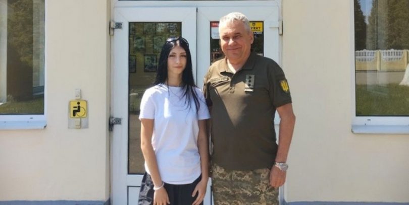 – Отже, маємо першу дівчину, яка хоче здобувати освіту в Олександрійській філії військового ліцею. Сніжана з села Хорів Острозької ТГ подала документи на вступ у 9-й клас навчання. Вона на фото з начальником ліцею Ігорем Приступою.