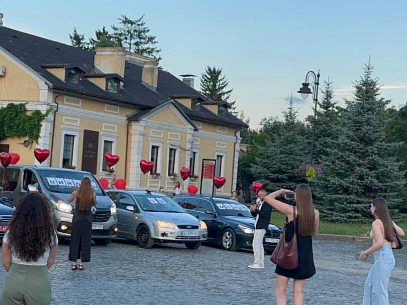 4 автівки з написом на лобовому склі “Ти вийдеш за мене?” неочікувано виїхали напроти замку Любарта. З одніє з машин вийшов хлопець з величезним букетом червоних троянд, став на коліно та попросив руки у своєї обраниці. Дівчина сказала “Так!”.
