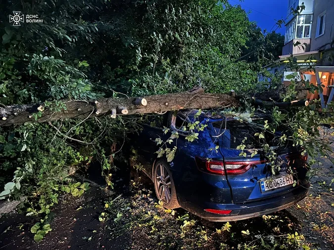 14 липня ввечері на лінію 101 надійшло повідомлення про те, що у Луцьку на проспекті Президента Грушевського через сильний вітер дерево впало на два автомобілі.