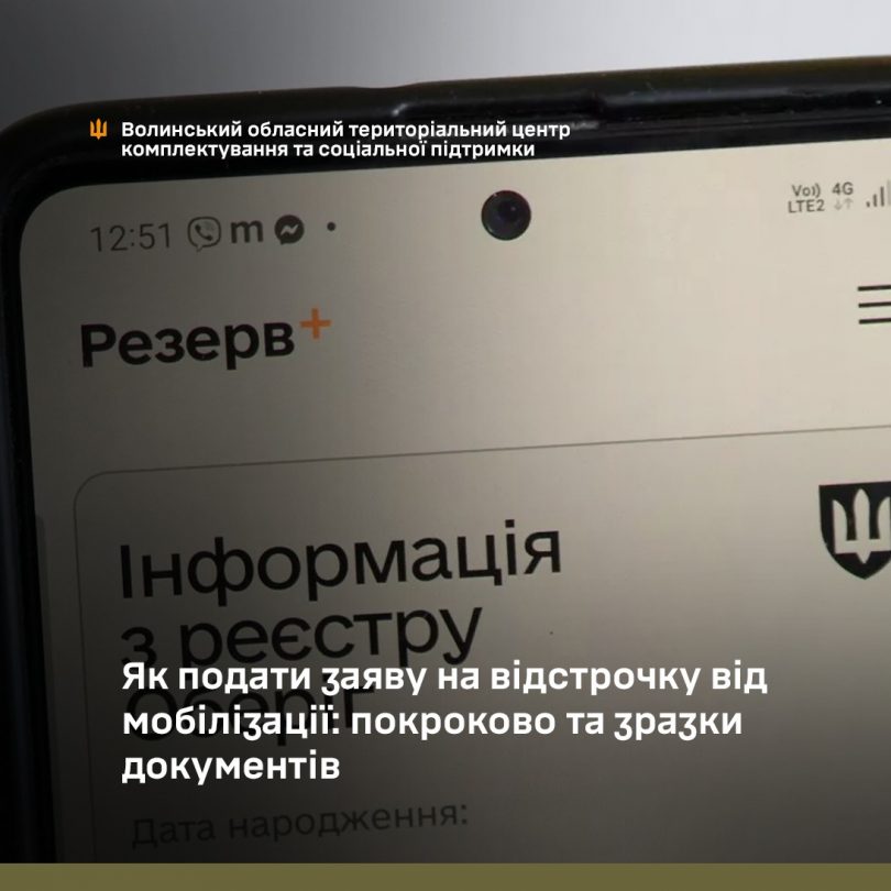 Нагадуємо: якщо у вас є підстави для отримання відстрочки від призову під час мобілізації, необхідно особисто подати заяву на ім’я голови комісії Р(ОМ) ТЦК та СП або відповідного відділу за місцем військового обліку.