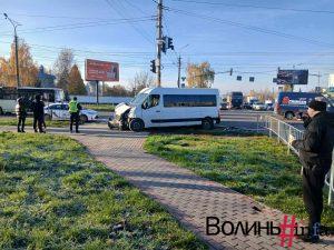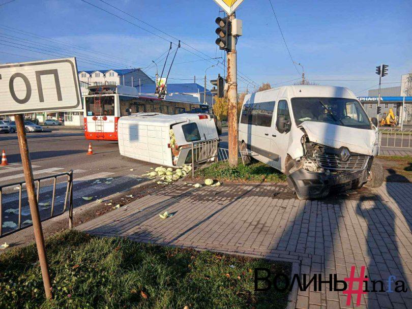 У Луцьку на Дубнівському перехресті сталася ДТП за участі двох бусів, один серед них від удару перекинувся на бік.