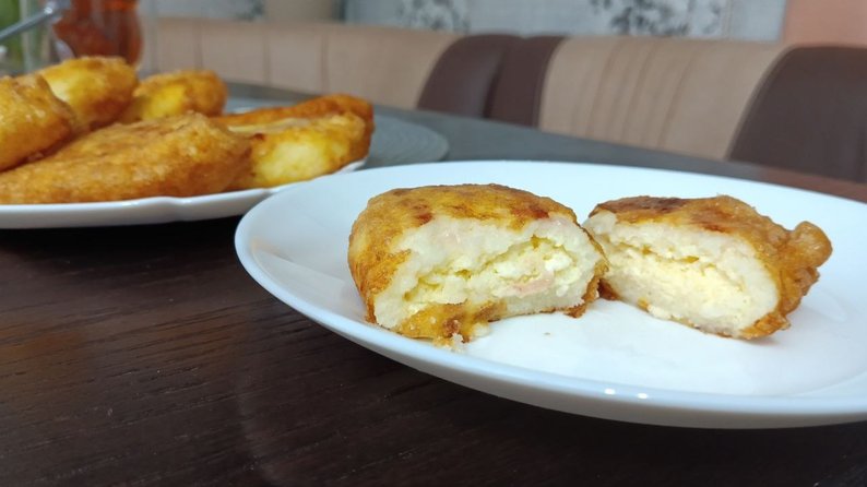 За словами господині, на порцію потрібно півлітри молока, 6 столових ложок манної крупи, сир, цукор, ванільний цукор, дрібка солі до манки, три яйця та борошно.