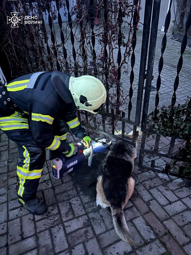 Біля одного з обійсть у місті Ківерці врятували пса, який застряг головою у конструкції металевого паркана.