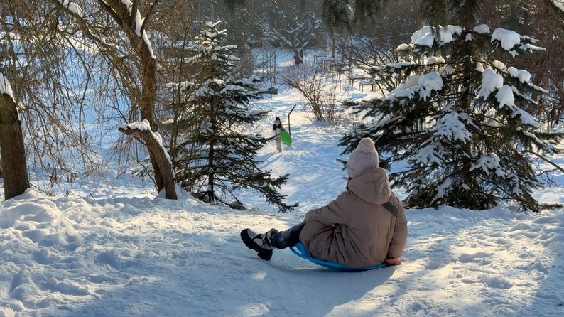 Євгенія Павлік привела спускатися з гірки семирічного сина Артема. Він одягнений у лижний костюм та катається на льодянці.
