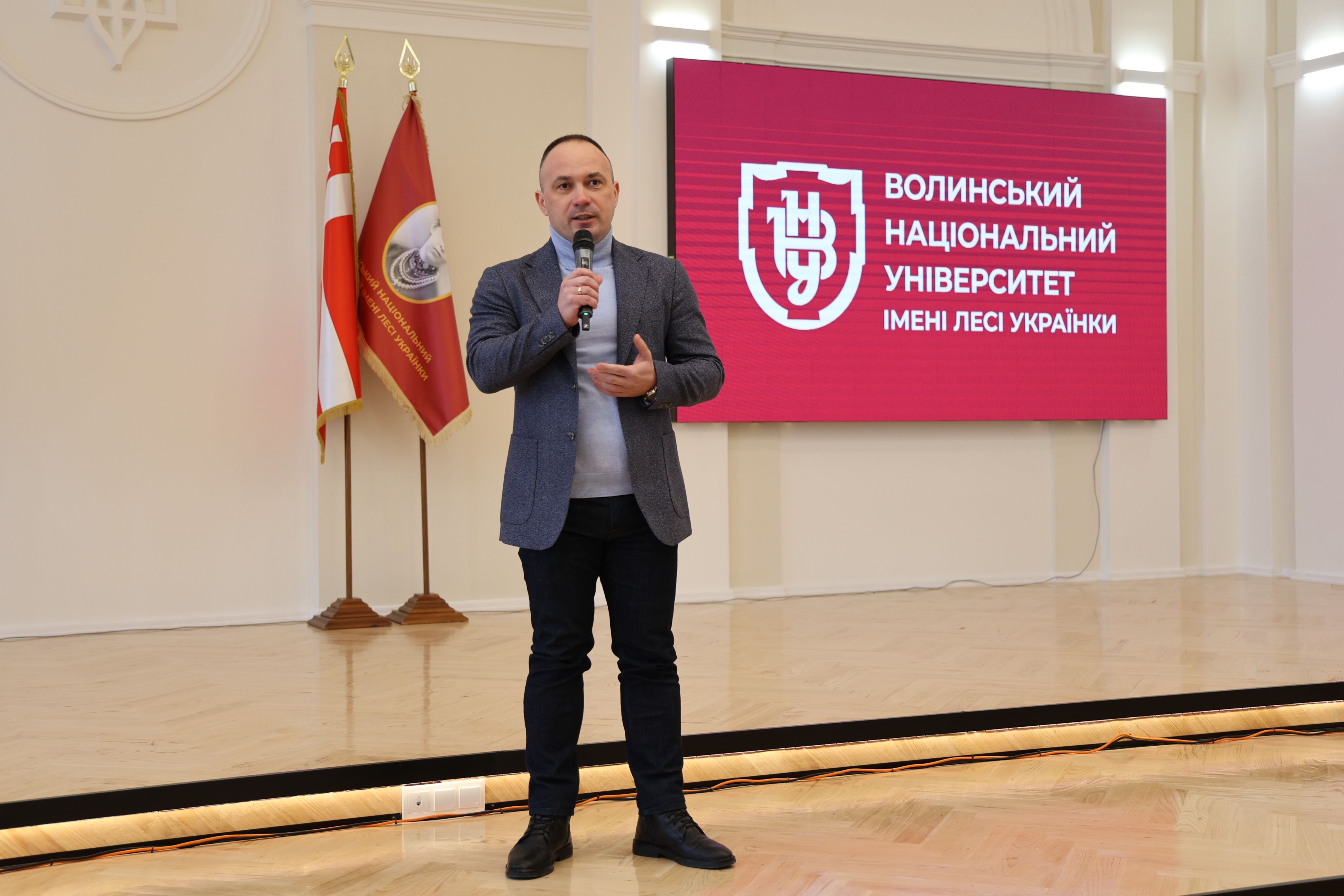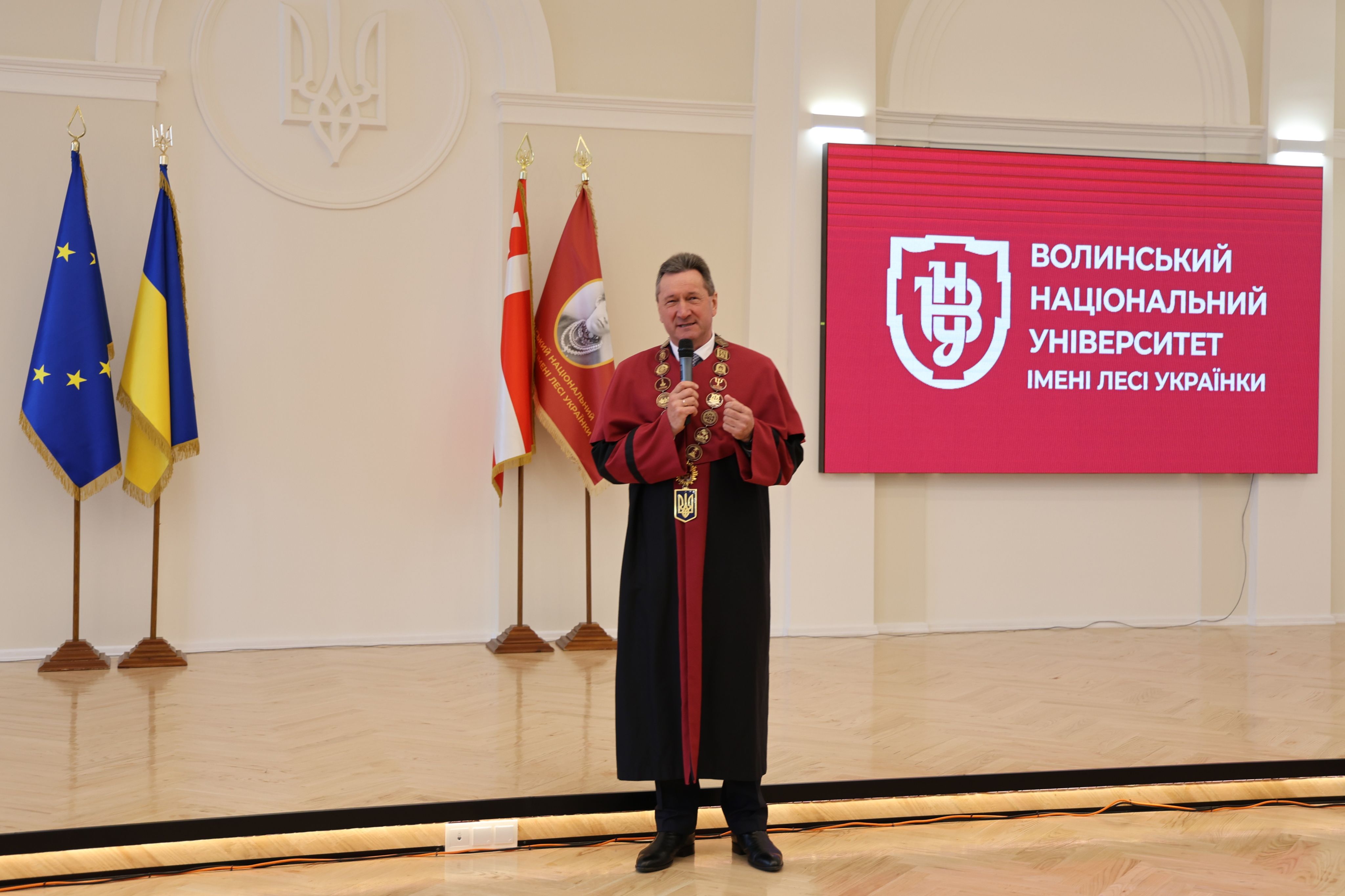 До присутніх також звернувся тимчасово виконуючий обов’язки начальника Волинської обласної військової адміністрації Роман Романюк. Він подякував ректору університету за принципову патріотичну позицію, а студентам – за виважений вибір здобувати якісну освіту у рідному виші. «Я щиро хочу побажати вам бути сміливими у своїх рішеннях, амбіціях та планах. Пам’ятайте: тільки сміливим підкоряється удача», – зазначив він.