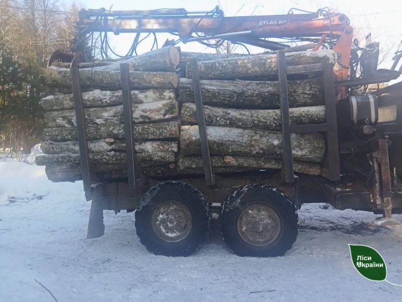 Поряд із транспортним засобом виявлено штабелі лісопродукції без маркувальних бирок. Склад розміщувався на ділянці, не призначеній для зберігання або складування деревини.